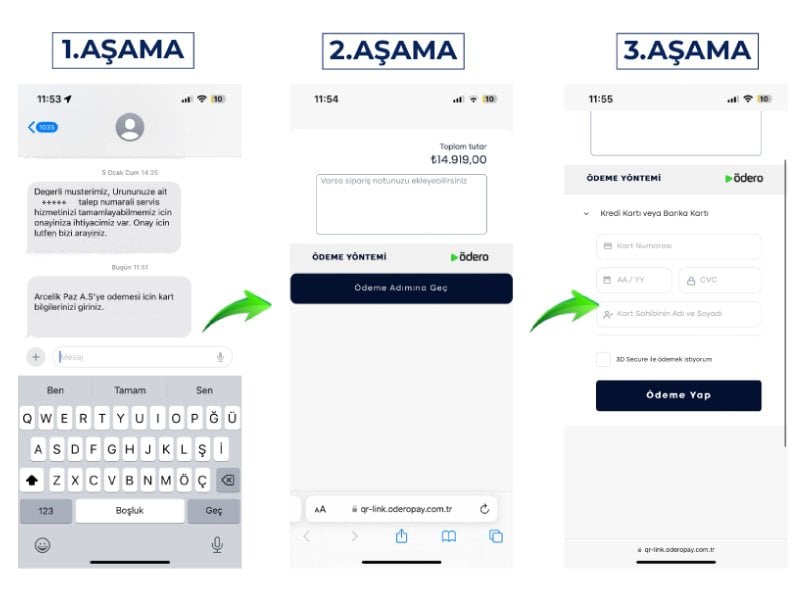 - 1. Aşama: Müşteri temsilcimiz ile iletişime geçtikten sonra sizlere ödemeye yapabilmeniz için sms yoluyla ödeme linki gönderilecektir.